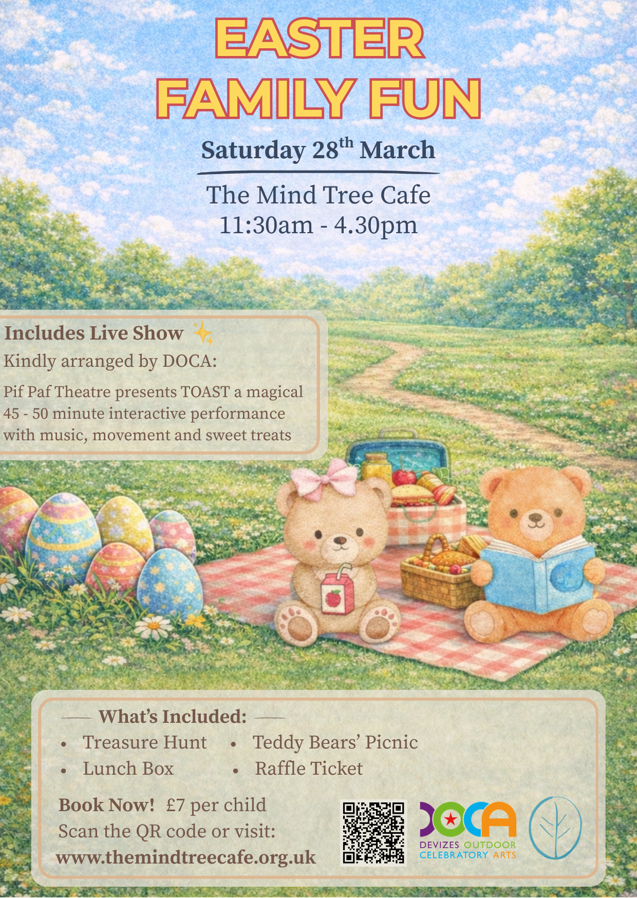 Easter family fun day at The Mind Tree Café, Your day includes treasure hunt around our orchard, teddy bears picnic and lunch box for children and 1 raffle ticket towards winning your own bear.
